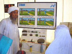 OMAR, which is running the biggest mine awareness programme in the world, claims to have educated over ten million Afghans on the risks of mines over the last ten years. Course take place wherever and whenever needed and focus on giving people the skills to identify and avoid the dozens of different types of land mines lying in Afghan soil.